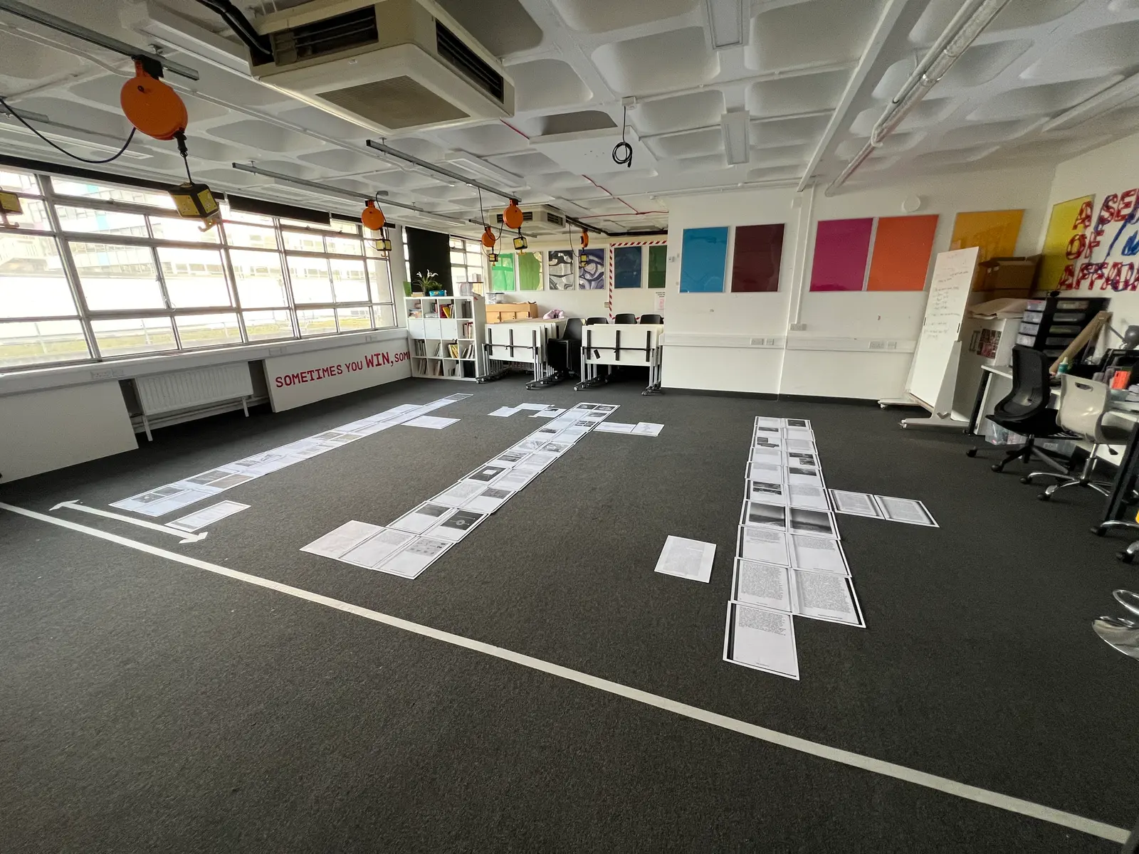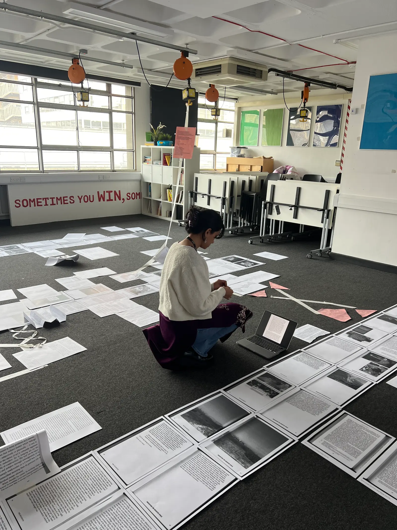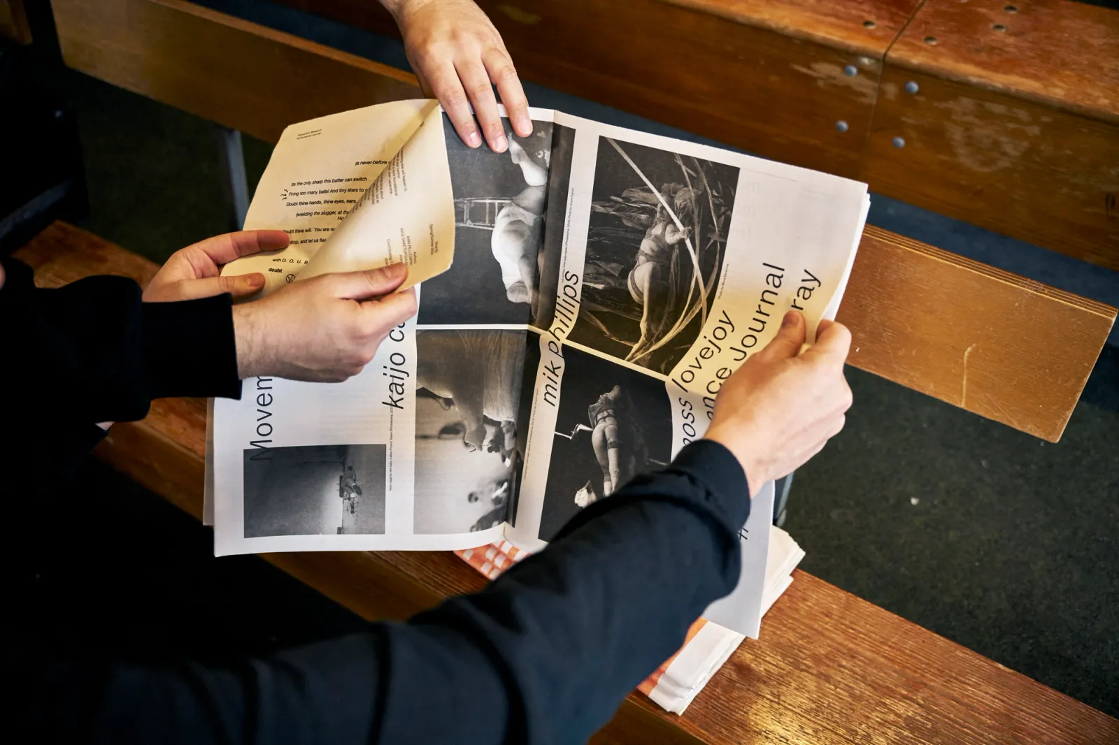 From the walls onto the printed page: the body as a publisher (A typographic opera) is a workshop that explores the relationship between publishing, performance, language and typography. It investigates methods of text activation (including silent, polyphonic, abrupt and disrupted reading), choreographic writing (through gestures, actions and orientation), the materials of reading (such as paper, screens, props and walls) and the bodies that engage in it (their positions and conditions).