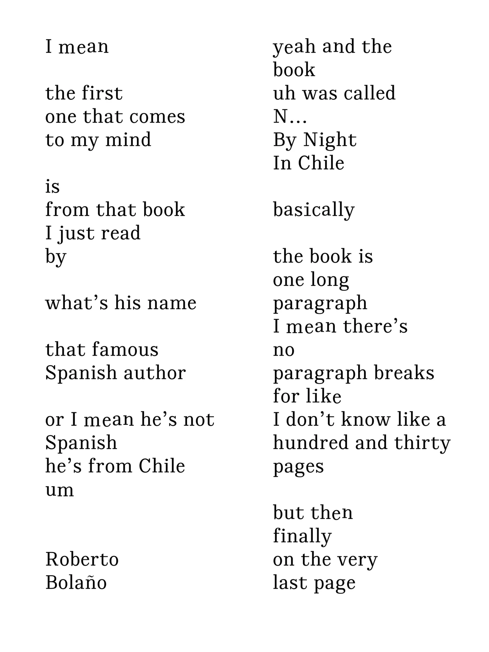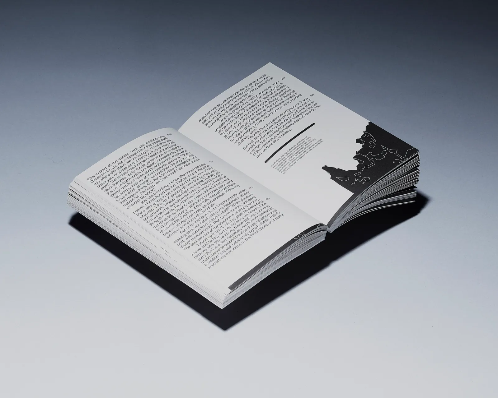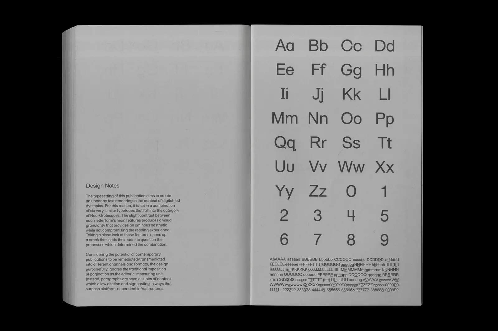 The typesetting of How to Run a City Like Amazon, and Other Fables (published by Meatspace Press) aims to create an uncanny text rendering in the context of digital-led dystopias. It is set in a combination of six very similar typefaces that fall into the category of Neo-Grotesques. The slight contrast between each letterform’s main features produces a granularity suggesting an ominous aesthetic while not compromising the reading experience. Taking a close look at these features opens up a crack that leads the reader to question the processes which determined the combination. Designed with Carlos Romo-Melgar.