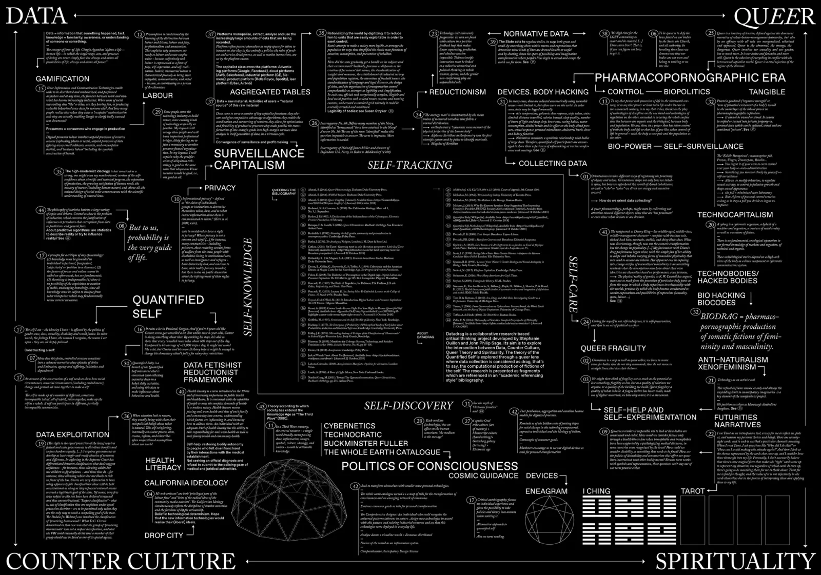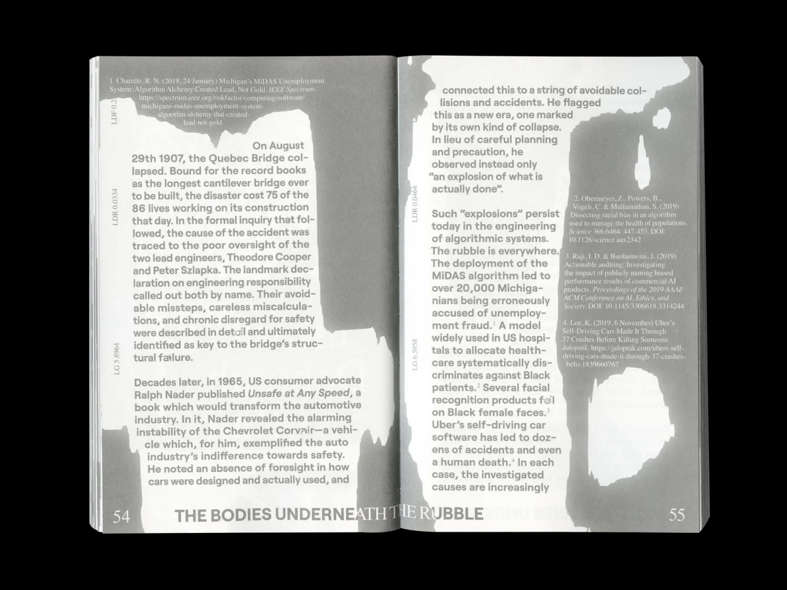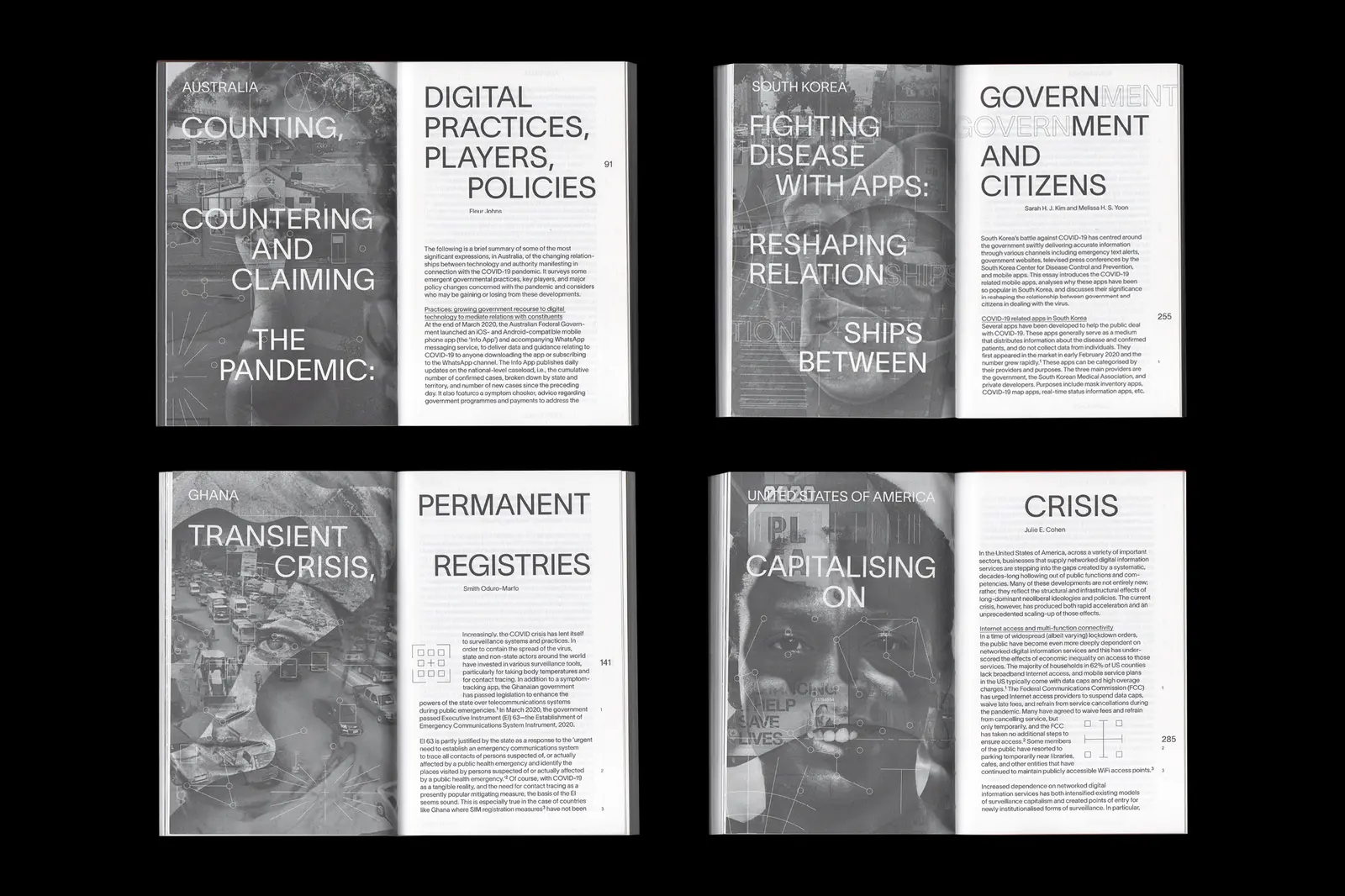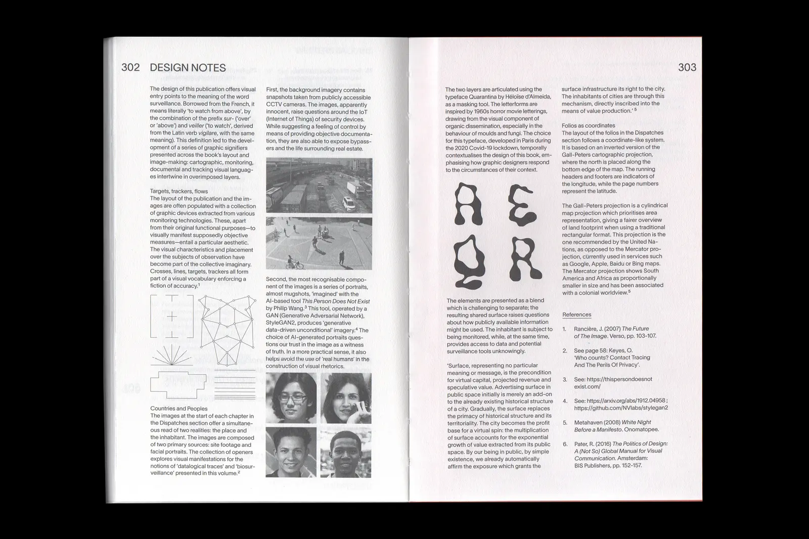 Data Justice and COVID 19: Global Perspectives, published by Meatspace Press, has a layout and images often populated with a collection of graphic devices extracted from various monitoring technologies. The layout of the folios in the Dispatches section follows a coordinate-like system based on an inverted Gall-Peters cartographic projection, with north placed along the bottom edge of the map. Running headers and footers indicate longitude, while page numbers represent latitude. Chapter openers offer a simultaneous read of two realities: the place and the inhabitant. Images are composed of site footage and facial portraits, exploring datalogical traces and biosurveillance. Designed with Carlos Romo-Melgar.