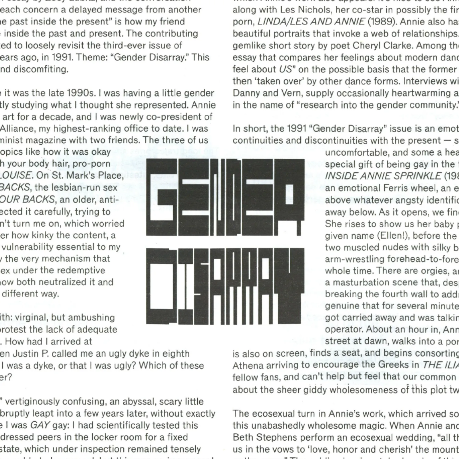 Issue #60 of the Movement Research Performance Journal revisits its controversial Issue #3, The Gender Issue (1991), which faced backlash for addressing “Gender Performance.” The design, titled Gender Disarray, adopts transtextuality as its central strategy, retrofitting formal elements from Issue #3 to collide with new content. We collected elements ranging from details like folios and signatures, to structural devices like the use of marginalia and carousel image sequences.