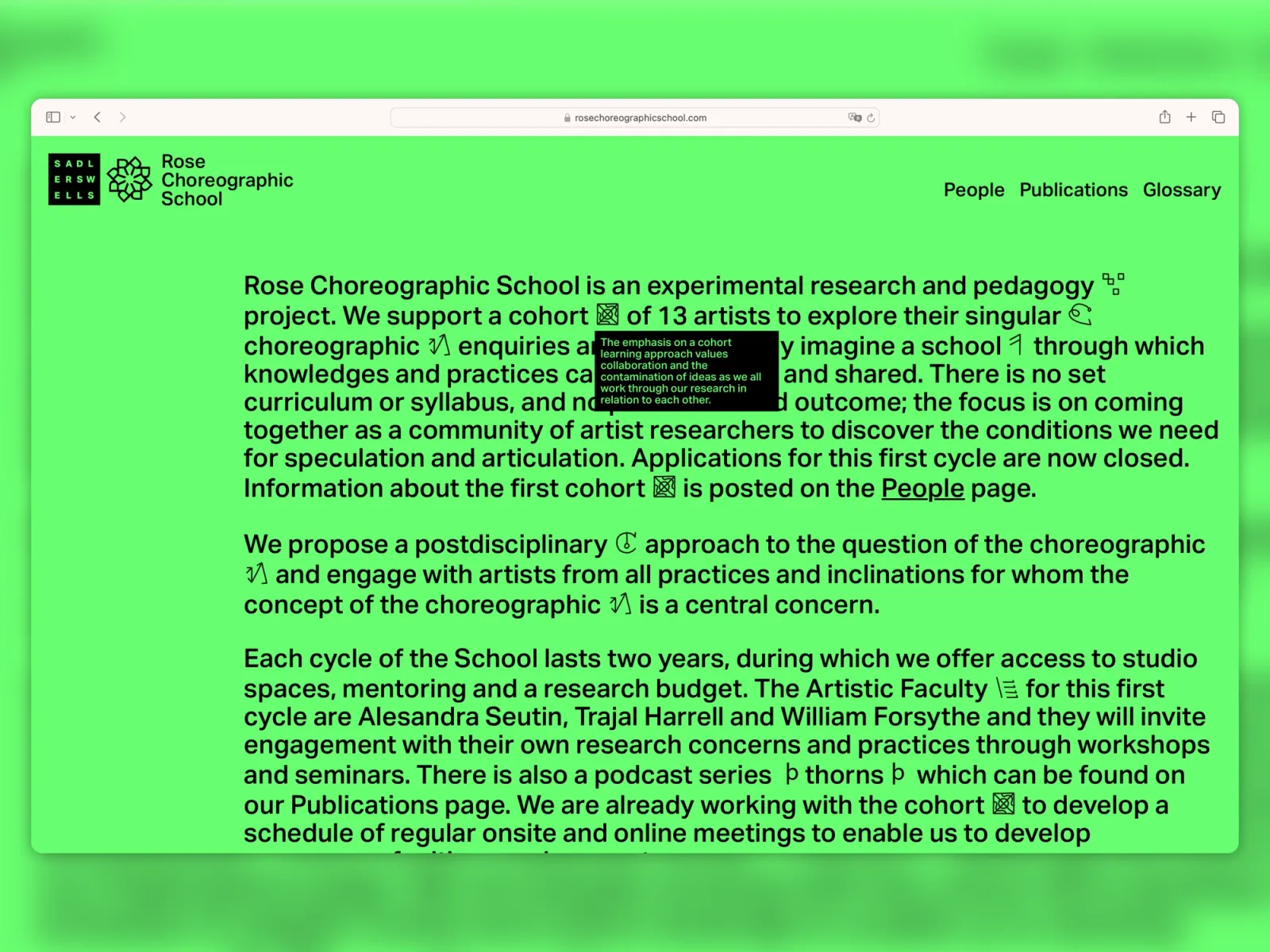 Identity and website design for Rose Choreographic School, a post-disciplinary pedagogic project at Sadlers Wells supporting artists in research around the concept of the choreographic, directed by Martin Hargreaves with faculty Alesandra Seutin, Trajal Harrell, and William Forsythe. Our approach prioritises relationships, creating a conversation space for a community of researchers, and making it visible towards online visitors. To facilitate this, we designed a system of signs that reflect the growth, contamination, and evolution of the RCS programme. the design of these sigils honors the history of graphic systems used to notate and codify dance, performance, and movement. While not direct reproductions, they act as metaphors, offering RCS participants a visual language to express and connect their concepts. Prioritizing relationships, the design creates a conversational space for the research community while remaining visible to online visitors. Presented as a glossary, the sigils populate the website, enabling non-linear, non-prescriptive navigation through the cohort’s and visitors’ evolving concerns. Designed with Carlos Romo-Melgar.
