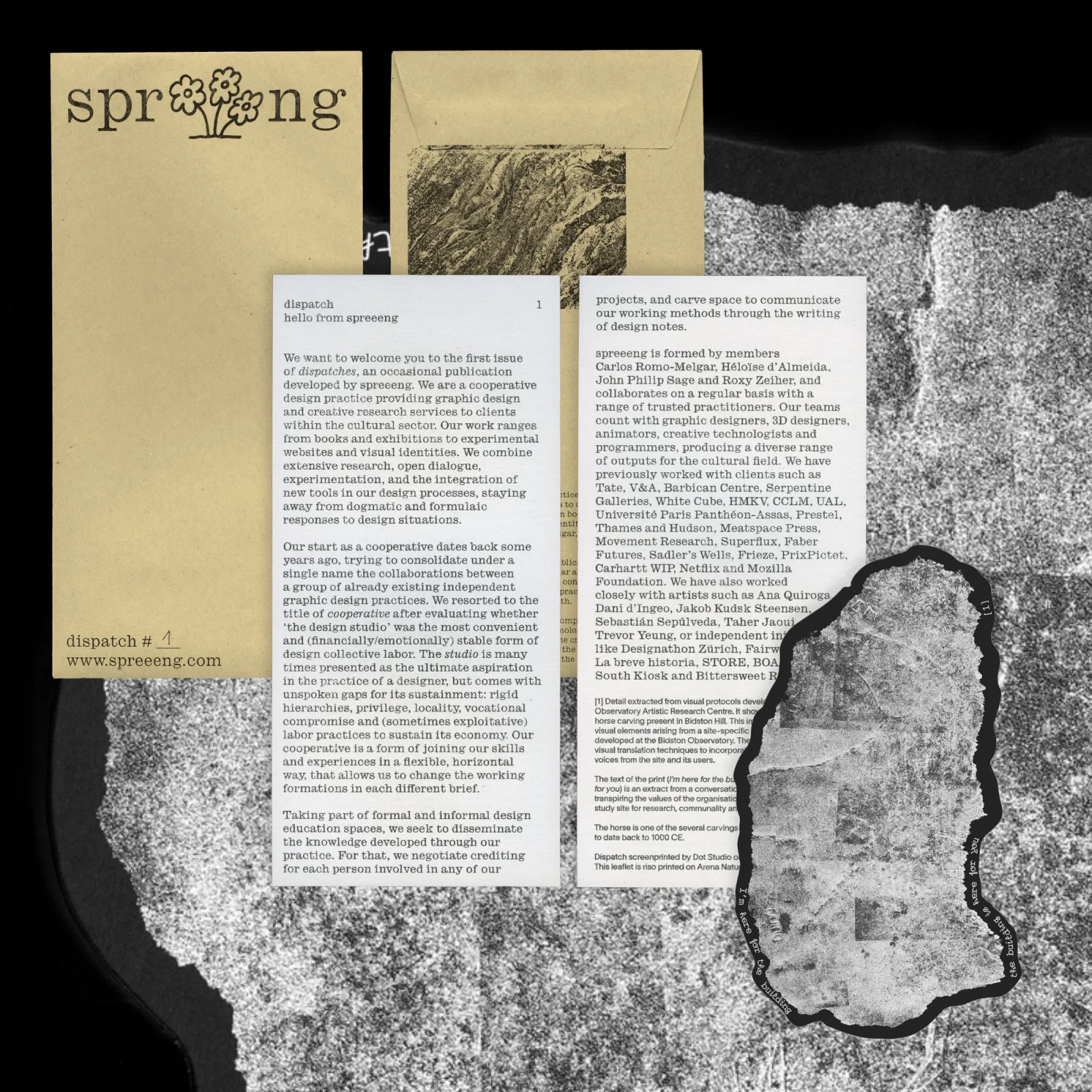A core principal of spreeeng is the dissemination of knowledge generated through design, including occasional publications like Dispatches, which focus on snapshots of our practice, alongside an ongoing commitment to formal and informal design education. The Dispatches gather details and material traces from works developed at spreeeng.