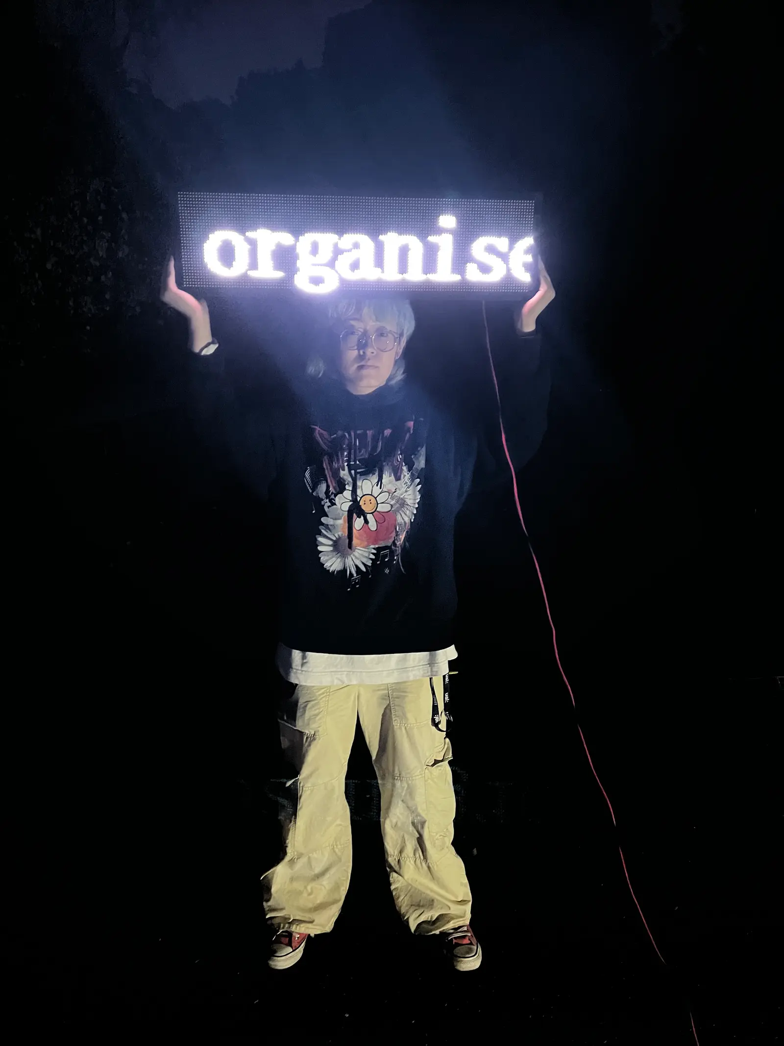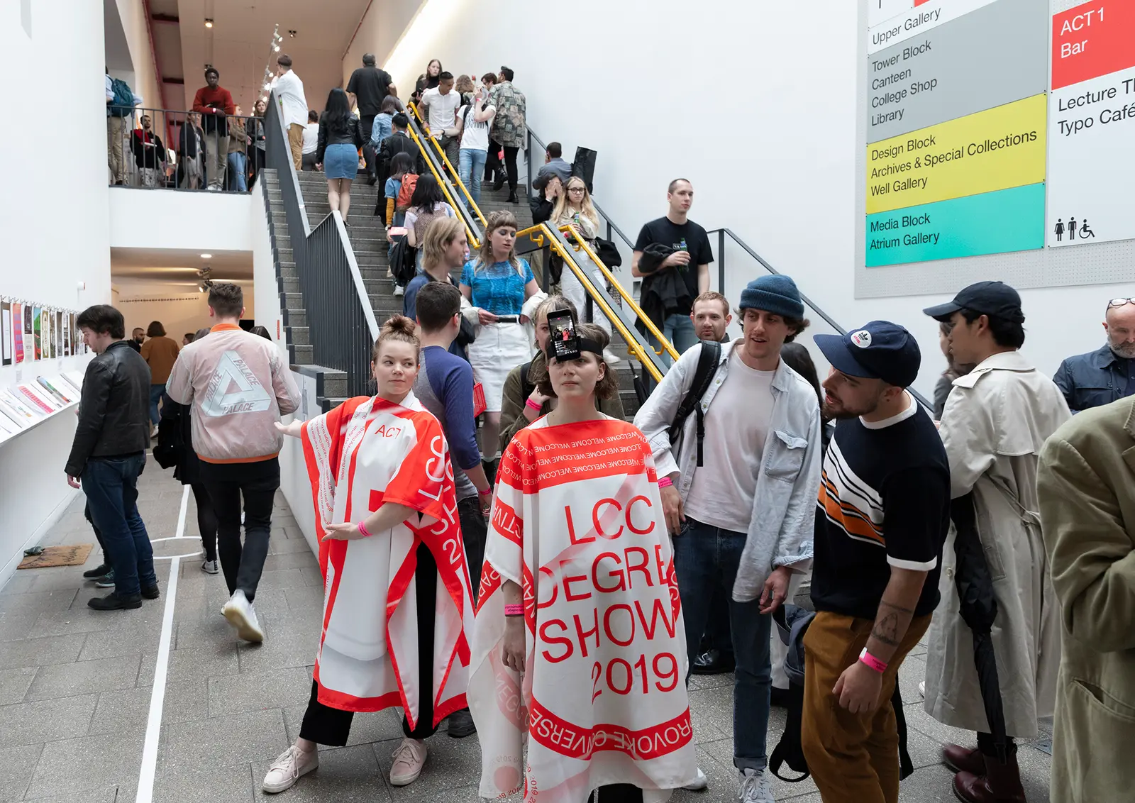 The design of the 2019 degree shows focused in creating a supporting visual system helping to navigate a spatially complex and visually saturated venue such as the London College of Communication. The show proposes a journey through the college building divided into six acts. The different acts are interconnected with each other and don’t overlap with the existing signage of the building. In order to guide visitors throughout the venue, we used a wayfinding system that mainly took place on the floors. This system, is activated by a group of performers during the opening night, delivering practical information and provocative questions to the audience in their interactions. This way, the opening night becomes a choreographed event in which the different actors (the work, the public, the performers, the institution), interact and expand the experience of a degree show, which was live-streamed to social media platforms. Designed with Carlos Romo-Melgar.