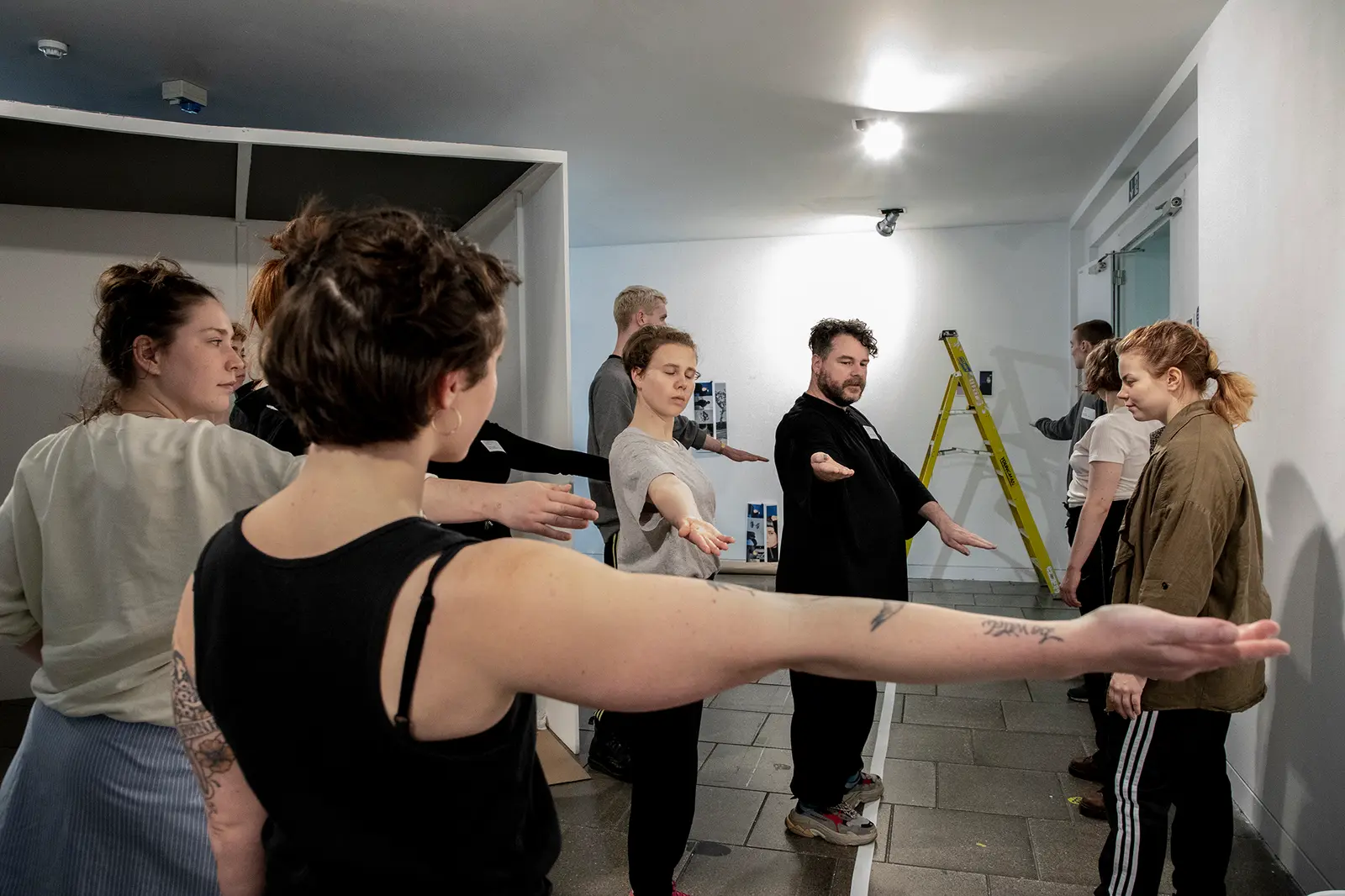 Christopher Matthews demonstrates movements inspired by the concept of a maître d’ to a group of performers for the LCC Degree Shows 2019.